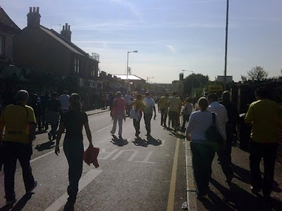 Pictures are of clear skies over Basingstoke, the slightly run down Watford stadium, fans walking through the terace streets to the game, George, Harry and I taking in some sun in a pub near the ground, and George and Harry buying their lunch from the pub barbecue. I have proved what a great single Dad I am today by allowing the lads burgers for lunch, and Curry (George) and fish and chips (Harry) for dinner! Nee Naw Nee Naw……… Bad Dad alert, Bad Dad alert, arrest that man, he is not fit to father children!!!