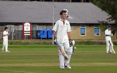 Yesterday George hit his best ever score of 31 retired (they have to retire at 30 at U13) as Oakley won again at Fleet to march further up the league in to third place with a game in hand. The pictures below show him hitting a four, and walking off unbeaten to the applause of team mates and opposition, a great moment for him.