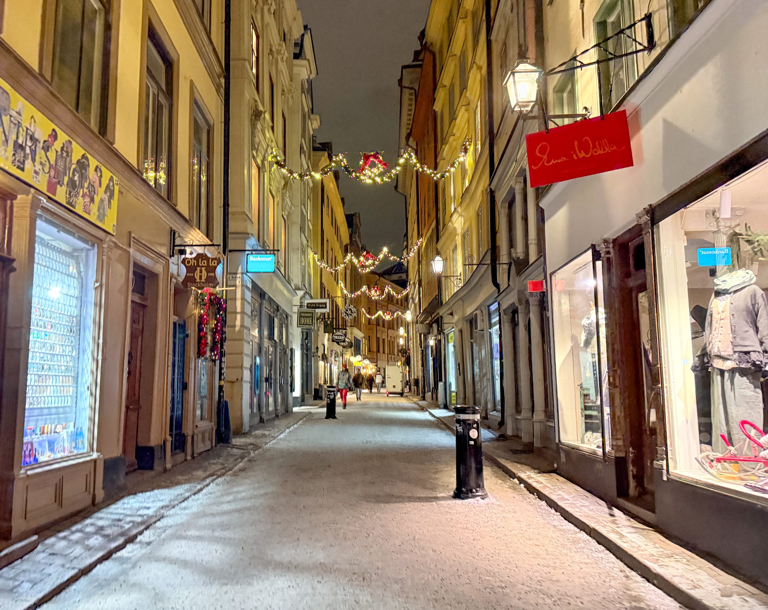 On our first evening we headed straight into the Old Town (Gamla Stan), and were struck by how wonderfully Christmassy it still felt. Narrow cobbled streets, softly glowing shop windows, warm light spilling out of bars and cafés, all dusted with a recent sprinkling of snow. If ever a place was designed for winter wandering, this is it.